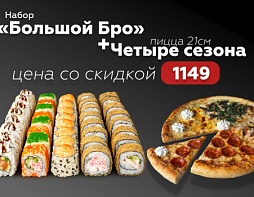 Когда хочется всего и сразу Набор «Большой Бро» — 40 шт, почти 1 кг роллов • пицца 21 см «Четыре сезона» всего 1149 ₽ вместо 1976 В одной пицце сразу 4 разных вкуса Идеально, если не можешь выбрать - попробуешь всё сразу Подойдёт на компанию или когда хочется разнообразия, а не одного вкуса Пока акция действует - бери по максимуму выгодно *Акция может закончиться в любой момент ** В одном заказе может быть неограниченное количество товаров со скидкой