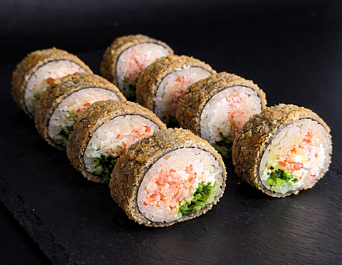 Рис, нори, замес краба, чука, сыр сливочный, унаги, кунжут, панко, кляр