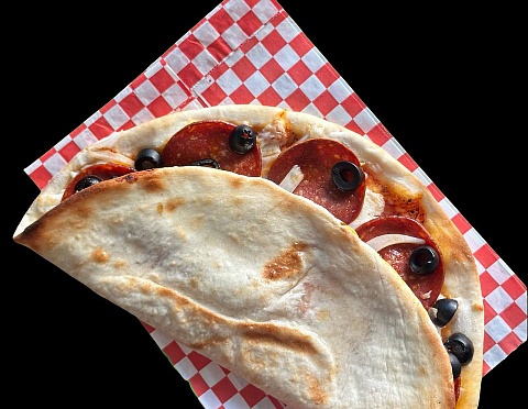 Пепперони, лук маринованный , маслины, моцарелла, тесто, красный соус